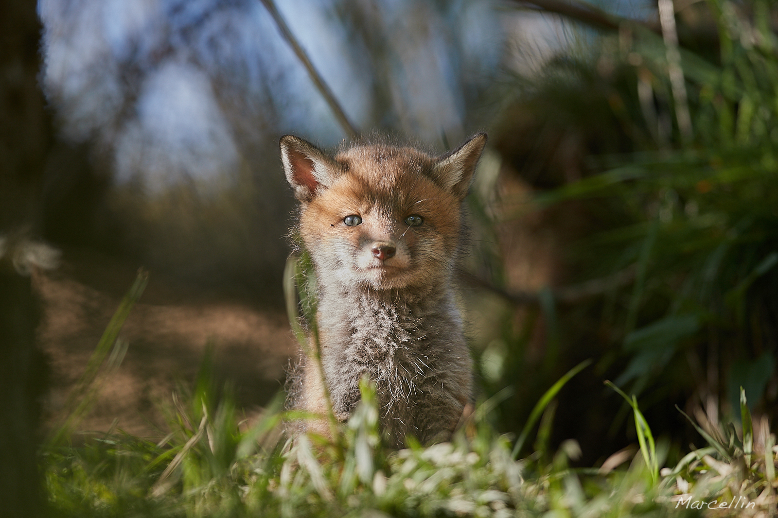 Après un peu plus de 30 mn d'attente je vois de l'agitation, et là mon premier renardeau sort et fonce dans ma direction il s'arrête brusquement à ma gauche et retourne violemment vers son refuge pour se positionner sur une bute, puis 3 autres renardeaux sortent et m'offrent un spectacle gravé à jamais.